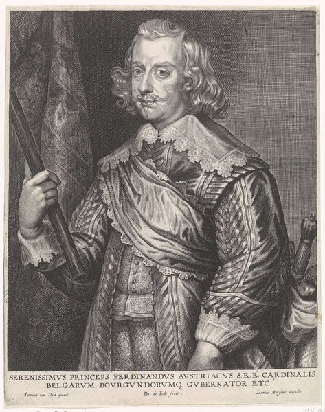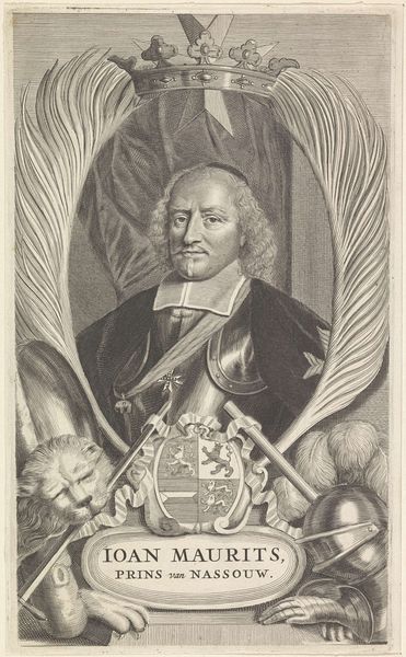 Curator: Cornelis van Dalen the Younger created this drawing in 1658. It is titled "Portret van graaf Johan Maurits". Editor: Immediately, I’m struck by the palpable sense of presence he commands, all rendered with what appears to be just pencil and charcoal. Look at the sheen of the armor, that soft fabric—such control! Curator: It is a compelling portrait. Johan Maurits was, after all, a significant figure in Dutch history, the governor of Dutch Brazil and a patron of the arts and sciences. Editor: Knowing that shifts things. It highlights for me the choices of presentation: the suggestion of architecture in the background, armor, a sword… these details actively construct Maurits’s identity, linking him to a very specific projection of power. Curator: Indeed, armor and weaponry are standard symbols of leadership and military prowess, common visual cues across many eras and cultures, from ancient Greece to early modern Europe. Here, however, it seems carefully calibrated—more symbolic than functional perhaps? He holds the sword rather than wields it. Editor: And rendered so delicately! Look closely, and you can see the varying pressures of the pencil that delineate texture, implying how much Van Dalen manipulated his materials. Consider also the time involved in this detailed execution: the labor required for such a portrait speaks volumes. It transcends mere representation. Curator: Absolutely, the Maltase cross prominently displayed hints at broader ambitions and loyalties, as well as his military distinctions, contributing to a specific message the artist conveyed in his drawing. But ultimately the intent might be about creating a lasting memory of the count. Editor: Yes! As a Materialist, it drives me to ask questions of display: Where did this hang? Who consumed it? Did this drawing become an object of reverence and/or propaganda? The materials ground the narrative to the economic reality. Curator: I find the drawing, in essence, reflects how carefully crafted symbols have power—not just in their time but in ours as well, if we’re willing to interpret them. Editor: And by analyzing Van Dalen's technique alongside Maurits' role, we grasp how artists molded identities—literal material shaping a cultural understanding of power in their world, which persists today.