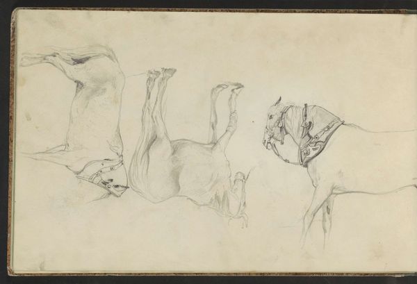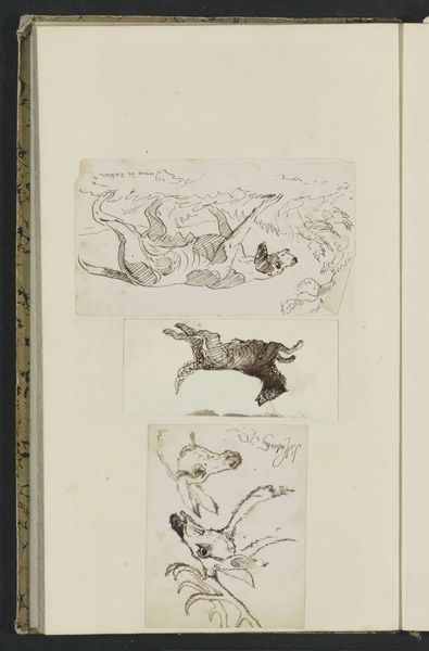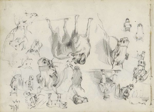 Curator: Right now, we're looking at a pencil drawing from around 1840 by Johannes Tavenraat, titled "Rocky Landscape with an Eagle and a Snake," currently residing here at the Rijksmuseum. What’s your first impression? Editor: Well, initially it seems rather chaotic, a jumble of disparate elements. There are upside-down pigs on the left. The whole scene appears… preparatory. Like a study sheet, not a finished statement. Curator: I get that. It feels like a collection of fragmented thoughts, a peek into Tavenraat's artistic process, as he's gathering impressions. The material quality feels very much like a sketchbook – intimate, immediate. You can almost feel the pressure of the pencil on paper. Editor: Exactly. And there's something about that sketch-like quality that disrupts the typical romanticism of the landscape. The "sublime" feels somehow…undercut, even satirized, by the inclusion of those nonchalant animals seemingly floating above a treacherous drop. It reduces that raw, overwhelming feeling to simple labor, simple construction on the page. Curator: Maybe, maybe not… Look closer. The rocky precipice with the snake poised above and the eagle swooping below definitely suggests that feeling of untamed wilderness – a favorite trope during the Romantic period. Editor: But think about the economic context, curator! Here you have the natural landscape rendered—the artist selecting and presenting a controlled experience for consumption through art markets. These are luxury items. Art isn’t separate from other forms of manual work. The materials themselves—pencil, paper, the means of producing copies, affect accessibility, democratisation. Curator: I agree that materiality plays a huge role in who has access and can participate in artistic expression. All those elements working together – the eagle as a symbol of power, the snake embodying hidden danger—capture something elemental. Plus the lack of colour places all the emphasis on tone, line, technique, like a piece of music distilled down to only melody. Editor: So the artistic gesture becomes one with natural forces then. Not unlike artisanal labour which combines technical knowledge of material qualities alongside gestures, which in a landscape represent its geography. Curator: I find myself leaving this work, pondering how Romantic ideals brush against the realities of production. There is an echo in my soul… Editor: And I leave thinking about art and commerce, craft and consumption... Food for thought.