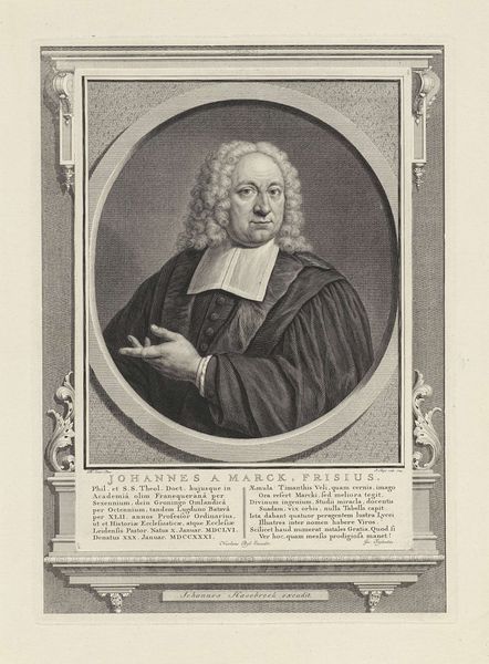 Pieter van Gunst created this print of Salomon van Til, a theologian from Dordrecht. The portrait, made in the late 17th or early 18th century, situates van Til within a complex framework of religious and political identity. During this period, the Dutch Republic was undergoing significant transformations, with religious and political tensions shaping the social fabric. Van Til, as a theologian, played a crucial role in these debates. His identity was not just personal but deeply intertwined with the religious and political ideologies of the time. The very act of commissioning a portrait speaks to the subject's desire to leave a mark on the world. Embedded within this image is the emotional weight of faith and conviction, reflective of a society grappling with questions of belief and governance. It offers insight into the ways individuals navigated and negotiated their identities within the intricate web of 17th and 18th century Dutch society.