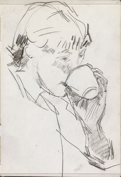 Editor: Here we have Isaac Israels' "Vrouwenhoofd met hoed of doek," made sometime between 1887 and 1934. It appears to be a sketch, almost like a preliminary study of a woman’s head and shoulders. It feels very immediate and personal, and I'm intrigued by the seemingly unfinished quality of the lines. What strikes you about it? Curator: What immediately grabs my attention is the masterful use of line. Observe how Israels, with remarkable economy, establishes the form. The cross-hatching, particularly around the face, isn’t simply shading; it’s actively constructing volume and directing the viewer’s eye. The lack of detail is quite deliberate, wouldn't you agree? Editor: Yes, absolutely! It seems like he is more interested in capturing a fleeting impression than photographic accuracy. How would you assess the relation between line and form here? Curator: The interplay is paramount. Notice the confident strokes that define the hat or head covering, and how they contrast with the softer, more tentative lines suggesting the face beneath. This creates a subtle tension, drawing attention to the subject's gaze. The varying densities of line create both depth and a sense of immediacy, characteristic of modernist aesthetics and its turn towards the artist's process and hand. It transcends simple representation. Editor: It's interesting how much information is conveyed with so little. Looking at this more closely, I now realize the expressiveness embedded in those ‘unfinished’ lines. Curator: Precisely. By foregrounding the structure itself—the active creation of form, not just its static depiction—Israels draws us into the very act of seeing. The materiality of the work, the paper and ink, and the active role they play become unavoidable and fascinating to engage with. Editor: I hadn't thought about it that way before! Thanks, I've definitely learned something new today.