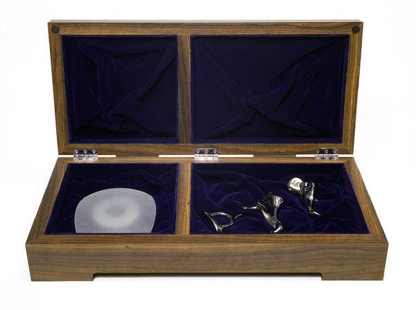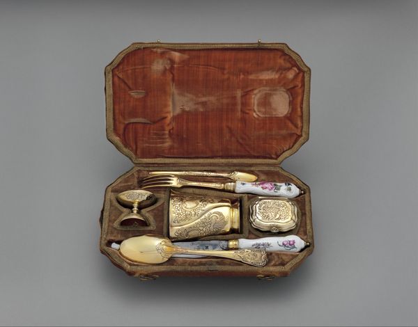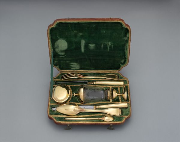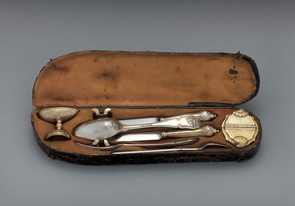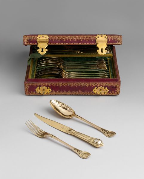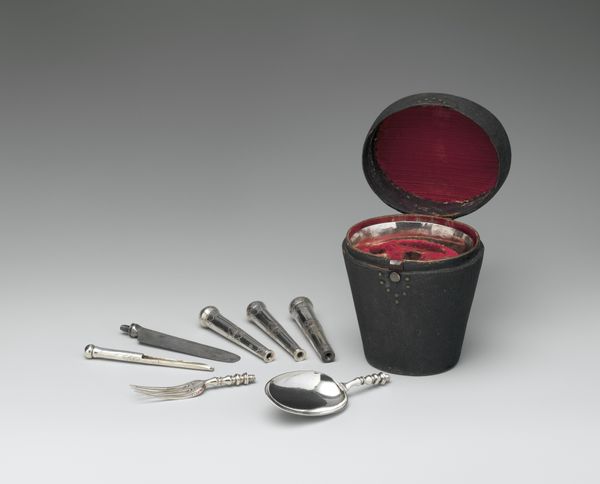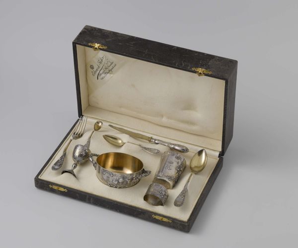 Curator: This is an object entitled "Cassette met twaalf theelepels," or "Casket with Twelve Teaspoons" crafted around 1838. What strikes you when you see it? Editor: Well, initially it has a sense of quiet luxury. A meticulously crafted wooden box lined with velvet, showcasing a set of elegant silver teaspoons. It feels almost ceremonial, set against the domesticity one usually associates with tea. Curator: Indeed, the contrast highlights interesting points. The box itself, carefully constructed from wood, speaks to artisanal skill, while the silver spoons denote status. It's crucial to consider the societal context. Silverware like this was far from commonplace. Owning twelve teaspoons suggests a certain level of affluence. Consider the labour involved in silver mining, smelting, and crafting—the human cost. Editor: Absolutely. One thinks about labour exploitation within systems of economic inequality in the 19th century, which often intersects with race, gender, and colonial exploitation. Teaspoons weren't just instruments; they signaled power dynamics at play, from production and manufacture, to presentation and ultimately the function, or performativity of pouring a cup of tea. Curator: Right. Each spoon's form is shaped through meticulous manipulation of the material. Consider the hollowing, smoothing, and polishing—the cumulative hours, possibly weeks of labor— invested to bring out its reflective qualities. Editor: And the fact that they are *twelve* teaspoons – not an odd number for personal use but meant to entertain visitors! This makes it function like a statement piece for social rituals. A visual marker of status within very complex hierarchies, especially relating to gender and class. Who has tea in that box? With whom? And why? The choice and design are politically meaningful! Curator: Precisely, consider the conditions of production alongside the implications of its use within social rituals and gender expectations. Editor: Examining this 'Casket with Twelve Teaspoons' from both a production and historical view sheds new light on it, showing it not just as silverware, but as an actor embedded in complex social frameworks. Curator: Right. The very act of consumption is inextricably linked to the materials and labor that produced this object and to the identity statements within social spheres that these items signal.