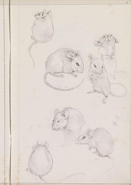 Editor: Here we have "Muizen," or "Mice" by Otto Verhagen, dating from around 1928 to 1930. It's a pencil drawing on paper. There's a gentleness to this sketch, a quiet observation of these little creatures. What strikes you about this piece? Curator: Well, immediately I’m thinking about the context in which an artist chooses to depict, and society values depicting, such a humble subject. How were animals, especially creatures often deemed pests, being represented at this time, and why? Consider the socio-economic factors. Were these studies meant for something else? Were there public health concerns relating to mice that might inflect its public perception? Editor: So you're thinking about the relationship between the imagery and broader social anxieties or scientific understandings of the time? Curator: Precisely. Were depictions of rodents, usually relegated to the margins of art, becoming more prevalent in public imagery? Was Verhagen reacting to or participating in some artistic trend tied to a rising interest in naturalism, or was it purely personal? We also have to consider the museum as a space for exhibiting art, its impact on how viewers interpret it. Editor: That makes me think about scientific illustrations too. They’re not necessarily celebrated as 'art' but hold immense value, both practically and culturally. Are you suggesting there could be a dialogue here between 'art' and something more documentary or scientific? Curator: Exactly. Think of institutions that displayed art in that period. Did museums or natural history collections shape our views of “acceptable” subjects for art? Or did the sketchbooks become like this in the context of museums that celebrated naturalist studies? That institutional lens can reshape even a simple drawing of a mouse. Editor: I never would have considered the political side of a mouse drawing. Thanks! I'll definitely keep these socio-political forces in mind when I look at other artwork. Curator: And I appreciate your insights into the overlap between art and other disciplines. That’s something to always consider in cultural narratives.