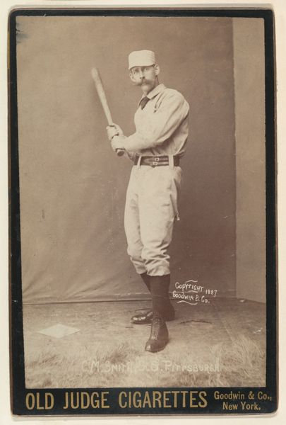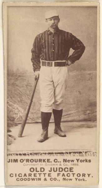 This is a baseball card of Clark, a catcher for Brooklyn, from the Old Judge series made by Goodwin & Company, likely in 1889. The sepia-toned photograph, confined within the rectangular frame, evokes a sense of nostalgia. Clark’s figure, centrally composed, anchors the visual field and exudes confidence. The formal structure of the card, though simple, speaks volumes about late 19th-century modes of representation and advertising. The baseball player, a cultural symbol, is transformed into a commodity, subtly aligning notions of athleticism and leisure with the consumption of Old Judge Cigarettes. The careful arrangement of text and image, serves to reinforce this message. Consider also how the sharp, linear text contrasts with the softer tones of the photographic portrait. This tension reflects a larger cultural shift toward the commodification of identity and the rise of consumer culture. This card, therefore, is not merely a portrait, but an artifact embedded within a complex network of signs and symbols, offering a glimpse into a bygone era.