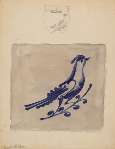 Yolande Delasser's "Jug" is an underpainted watercolour on paper, and it feels like a page torn from a sketchbook. The top part of the page has a jug in pencil outline. Below that, Delasser paints a solid block of brownish colour, within which is a sinuous bird-like form. The block of colour looks like watercolour, brushed on in thin washes, it stains the paper. The bird itself is outlined in a dark grey or blue, with spots within its body, creating a decorative effect. It’s a humble image and yet the lack of showiness gives it a strange kind of power, like it’s whispering a secret in your ear. The painting reminds me of Guston’s late paintings, a kind of rough and ready language, where the form and colour don’t quite line up, and the process feels so intuitive, like one mark informs the next. Ultimately it is the work’s lack of fussiness that makes it so compelling.