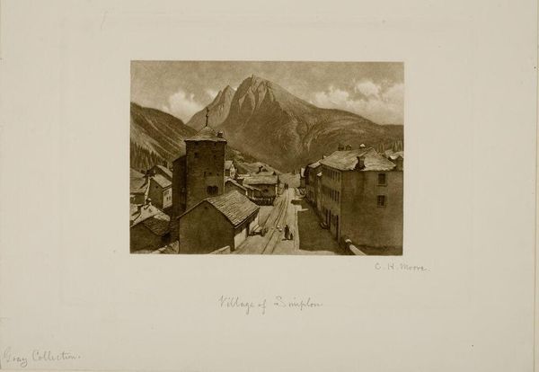 Curator: Charles Herbert's "Village of Simplon" presents a captivating view of a village nestled at the foot of towering mountains. The print captures a specific location without offering a specific date. Editor: There's such quietness in this composition, despite its scale. The buildings are solid geometric forms, anchored by that imposing church tower. Curator: The village of Simplon holds historical significance as a key passage through the Alps. Its inhabitants would have been deeply connected to this landscape. Editor: The artist's manipulation of light emphasizes the contrast between the solid architecture and the vast mountain range. The textures are rendered with remarkable detail, from the rough-hewn stone to the soft clouds. Curator: It would be interesting to understand who lived there and who was passing through, and how the construction of the village shaped its inhabitants' lives. Editor: Indeed. These spatial relationships, the verticality versus the horizontality, create a narrative on their own. Thank you. Curator: My pleasure.