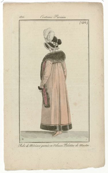 This print, made by Aaron Martinet in 1823, presents an image of Parisian fashion through the combined techniques of etching and engraving. Consider the crepe, lace, and feathers used to make the hat, the silk of the dress and the fine weave of the shawl. Each of these materials speaks to a network of labor, from silk worm cultivation and textile production to the artistry required for lace making. The techniques of etching and engraving, with their linear precision, translate these tactile qualities into visual form. These were highly developed skills, and the print medium allowed for the wide distribution of fashion trends, fueling the cycles of consumption. Martinet's print isn't just a picture, it's a document of material culture, a visual representation of the complex relationship between production, artistry, and the aspirations of Parisian society. By focusing on the making, we can reveal the economic and social context embedded in this image.