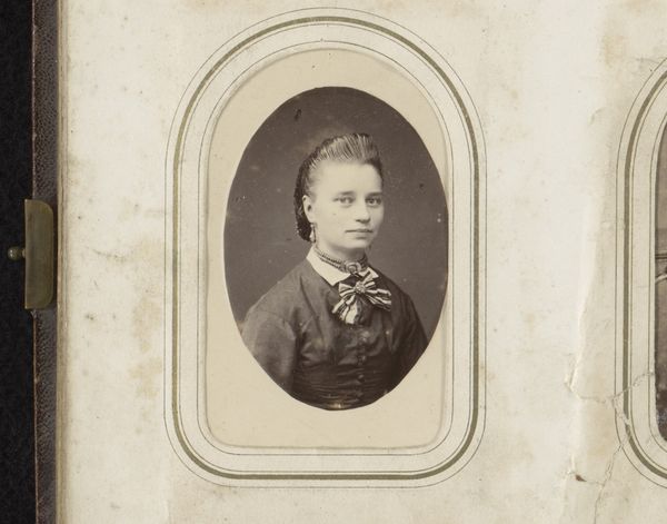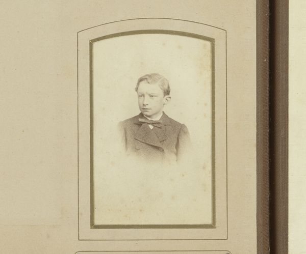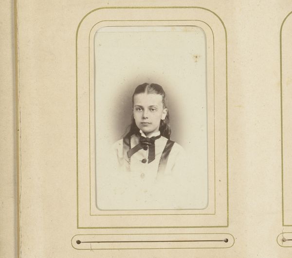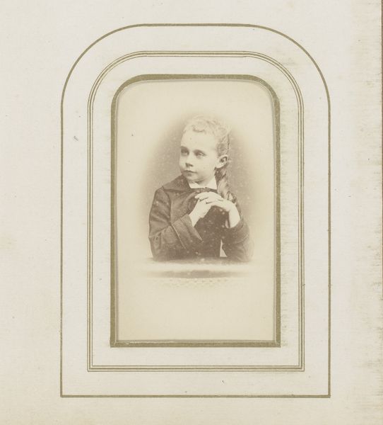 Curator: This is "Portret van een jongen met hoed," which translates to "Portrait of a Boy with Hat" by Prosper Deloeul, dated between 1873 and 1875. It's a gelatin-silver print. Editor: What strikes me immediately is the direct gaze; intense, but slightly melancholy. And why is it titled Portrait of a Boy with Hat, when this appears to be a girl? The embellishments on the clothing, the way the hair is coiffed all appear rather feminine. Curator: It is intriguing. These early photographic processes were laborious and expensive. Gelatin-silver prints, specifically, involve coating paper with light-sensitive emulsion and then careful development. The frame around the image is very clean, as is typical of a photographic print produced with these processes. There's also the matter of clothing production; one wonders how readily available such a quality material was in their time and social environment. Editor: The elaborate bow at the neck acts almost like an heraldic emblem, wouldn’t you agree? It's more than mere decoration. Given the time, it might signal family lineage, social aspirations. Also, this portrait evokes that peculiar Victorian fascination with childhood innocence, combined with a preternatural seriousness. Look at the expression, a weight that seems beyond the sitter's years, no smile or glimmer of play. Curator: Right. The symbolism points to a culture grappling with industrial progress. Photography like this both documents and participates in constructing societal ideals. I’m curious about where the photographer had their studio, and to whom they provided services. That also adds an economic layer. Was this affordable, who owned photography equipment, and how would this family have known this photographer? Editor: Indeed. Beyond documentation, portraiture elevates its subject, conferring status, almost ritualistically embalming an instant. Note how Deloeul frames his subject within layered rectangles with rounded edges. It lends importance, echoes perhaps a locket or family crest shape. These photographs become vessels, little cultural time capsules loaded with aspirations and concealed anxieties. Curator: Seeing this from the material process adds another dimension; to think of it in terms of economics of both materials and labour opens it up. So the next step will be a little historical sleuthing. Editor: And I shall go down the rabbit hole of symbolism! Wonderful.