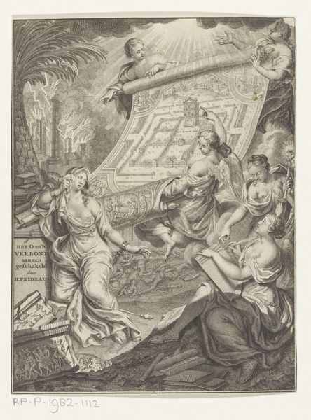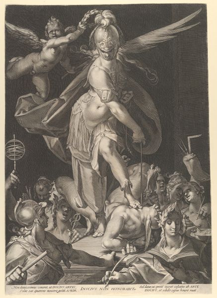 Editor: This is "Martyrdom of Saint Catherine, after Bernardino Passari," an engraving from 1588. It’s currently at the Met. There is a dramatic scene with figures and complex compositions and lighting, it’s a really compelling piece to study. What symbols or narratives stand out to you? Curator: Immediately, I am struck by the figure of Saint Catherine. Her pose, with hands clasped in prayer, acts as a visual anchor amid chaos, she remains centered and stable. What do you see in her halo, and the light surrounding her? Editor: There's this beam of light descending, almost like a spotlight on Catherine, and a winged figure emerging. Curator: Precisely. That figure represents divine intervention. Notice how it contrasts with the broken wheel – the instrument of her failed torture – in the foreground? This becomes an important symbol. Editor: Yes, that image is pretty stark, with all the broken pieces strewn about. Curator: The broken wheel and failed martyrdom would have had a strong resonance for contemporary viewers, hinting at the triumph of faith over earthly power and injustice. Catherine’s unflinching devotion resonated in a period marked by intense religious conflict and reformation. How does seeing that make you reconsider its significance? Editor: That context definitely reframes the image. The chaos isn’t just visual spectacle; it's a representation of real historical turmoil. Curator: Absolutely. Consider how Catherine became a symbol of defiance against oppression. Also notice the ranks of armored figures who symbolize Roman imperial power and military strength. How does the imagery impact you now? Editor: I see it as not just a historical scene, but an allegory. A statement on faith and resilience, loaded with symbolic meaning that speaks beyond its time. Curator: Indeed. Looking deeper at these enduring images helps us understand their cultural influence and appreciate the power of symbolism to convey complex ideas throughout history.