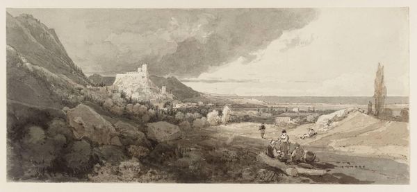 Editor: This is Lady Susan Elizabeth Percy's "Orvieto," a watercolor piece. It's quite atmospheric, almost dreamlike. What compositional elements stand out to you? Curator: Notice how the artist uses a limited palette to create depth. The gradations of grey and blue not only define form but also establish a visual hierarchy. The fortress is highlighted through contrast, whereas the foreground dissolves into abstraction. Editor: So, the technique itself emphasizes the subject? Curator: Precisely. The artist employs washes to suggest rather than depict, lending the scene an ethereal quality. How does this affect your understanding of the work? Editor: It makes me focus on the overall mood instead of specific details. Curator: Indeed, the formal structure invites a more sensory, less literal interpretation.