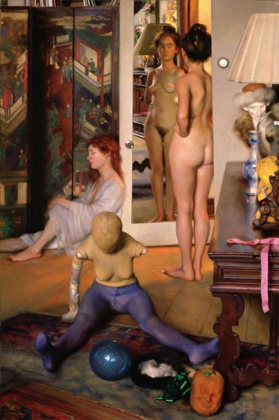 Editor: This is Paul Delvaux’s “The Temptation of Saint Anthony,” painted in 1945. The oil paint creates an eerie, dreamlike quality. What strikes me most is the depiction of the women; their bodies feel like sculptures, yet their gaze seems strangely vacant. What do you make of this scene? Curator: Delvaux is using surrealism here to explore the male gaze and the anxieties of postwar Europe, especially concerning female sexuality. The women, seemingly presented as objects of desire, are simultaneously distanced, almost alienated from their own bodies. Editor: So, you are saying the ‘temptation’ isn’t necessarily about Saint Anthony’s struggle, but something more complex? Curator: Precisely. Consider the historical context: this painting emerged in the aftermath of World War II, a time of immense social upheaval and re-evaluation of gender roles. How do you think this atmosphere might have impacted Delvaux's perspective? Editor: I guess it might represent a discomfort with traditional power structures and idealized female figures being scrutinized, especially with new concepts and theories evolving in postwar discourse… Curator: Exactly. The staging almost feels like a critique of power. The nudity confronts viewers while their detachment raises interesting questions. Is he liberating them or further objectifying? The women also hold agency through their silence and knowing gaze. It’s unsettling but prompts reflection. Editor: It’s like Delvaux is prompting us to unpack our own preconceived notions, and how cultural shifts inevitably impact these depictions. It is uncomfortable, in a fascinating way. Thanks, this has been enlightening! Curator: And a powerful illustration of how art is shaped by and reflects on social and political landscapes.