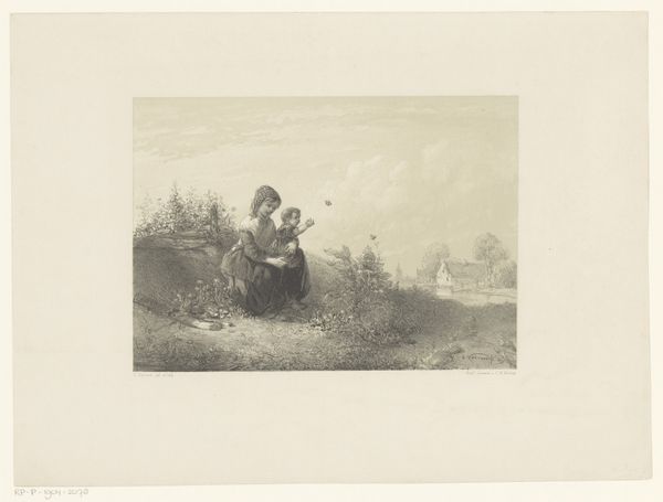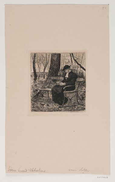 Willem Witsen made this etching, "Boerin wast textiel in een emmer," which translates to "Farmer's wife washing textile in a bucket," using a metal plate covered with a waxy ground. The artist scratched an image into the ground and then immersed the plate in acid, which bit into the exposed metal, creating an image. The print depicts a woman outdoors, bending over a bucket, diligently washing clothes. The image speaks volumes about the labor involved in textile maintenance, a task far removed from the industrialization that was beginning to transform the textile industry at the time. This piece reveals a stark contrast with the rise of mechanized production. Witsen's choice of etching allows for detailed lines and tonal variations, capturing the weight of the wet fabric and the humble setting. The print elevates a common scene of daily labor to the realm of art, prompting viewers to consider the social context and the value of work often unseen.