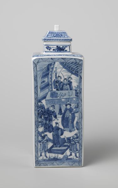 Curator: Welcome to the Rijksmuseum. Here we have an intriguing object: an earthenware square bottle with lid dating from approximately 1675 to 1699, of unknown authorship. The blue and white painting depicts a narrative scene of warriors in a landscape. Editor: It's delicate but impactful. The limited color palette creates a wonderful sense of unity, even with such a busy composition. There's a naive quality that keeps it from feeling overly formal. Curator: Precisely. The choice of earthenware speaks volumes about its intended purpose and place within its historical context. Unlike porcelain, earthenware was more accessible, a utilitarian object elevated through pictorial narratives. Editor: You're right, and looking at it this way highlights the skill of the artisan involved in both shaping the bottle and painting the detailed figuration. It must have been a prized object even though the materials weren't precious. Think of the kilns firing pieces like this, the social dynamics of workshops, the trade routes along which it traveled! Curator: I am compelled by how the artist uses linear perspective within a flattened picture plane. Note how the figures create depth. We can read these aesthetic choices by thinking of the visual grammar of storytelling from that time. It creates a wonderful dialogue. Editor: It definitely underscores how techniques and motifs travelled between cultures, and it highlights how something considered functional could also convey deeper meanings. What role did these kinds of objects have in households? Were they purely decorative, or did they hold specific ritual value? Curator: Interesting questions to ponder, especially given that the maker is anonymous! What we see here is not just a container, but a canvas, bearing visual cues to help decode both artistic styles and cultural habits. Editor: A testament to craftsmanship in everyday life, wouldn't you say? From raw clay to elaborate scene, it’s a great intersection of art, utility, and society. Curator: A perfectly nuanced perspective. Thanks for bringing it into focus. Editor: The pleasure was all mine.