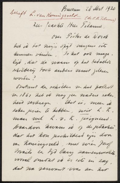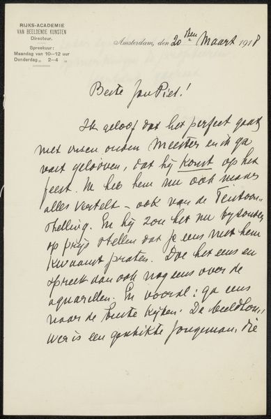 This letter to Jan Veth was written in Amsterdam on the 5th of February, 1920, by someone at the Rijksakademie van Beeldende Kunsten. The handwriting has such an elegance, doesn’t it? Notice how the ink is consistent and the lines are fluid, probably written using a dip pen, it's the kind of process that makes you slow down. The letter, with its looping lines and consistent pressure, feels so personal, almost like a drawing in itself. I'm drawn to the way the downstrokes of the letters create a rhythm, a dance of light and dark across the page. It’s like watching someone think, the words flowing directly from the mind onto the paper. It reminds me a little of Cy Twombly’s calligraphic paintings, where the act of writing becomes a form of abstract expression. Letters like these, connecting artists across time and space, remind us that art is an ongoing conversation, an exchange of ideas and intimacies. It makes you wonder what Jan Veth thought when he received this letter, what mark it left on him.