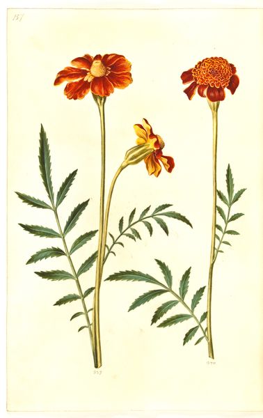 Editor: Right now we're looking at "Lilium bulbiferum (brand-lilje)," a drawing in tempera and gouache from sometime between 1635 and 1664, by Hans Simon Holtzbecker. It’s a striking botanical illustration. The colours are so vibrant! I'm curious, what draws your eye most when you look at this piece? Curator: It’s like Holtzbecker took the memory of summer itself and trapped it on paper. It makes me think about the tradition of botanical illustration during that time – partly scientific observation, partly artistic showmanship. Look at how precise the lines are, then notice the little imperfections – like the subtle mottling on the leaves. I see both reality and the artist’s own interpretation. Editor: The detail is incredible, but were these types of images used for pure research or more aesthetic purposes? Curator: It's both! Often these drawings would be commissioned by wealthy patrons keen to catalogue the natural world, but who also appreciated the beauty of art. Think of it like a 17th century coffee table book. It was as much about showing off your status and discerning taste as about recording species! Editor: That makes so much sense! I hadn't considered the performative aspect. I’ll look at these drawings with a fresh perspective moving forward! Curator: Precisely! And who knows, perhaps Holtzbecker himself nurtured this fiery lily in his own garden and documented his cultivation practices through illustration. I’ll let your imagination be the judge.