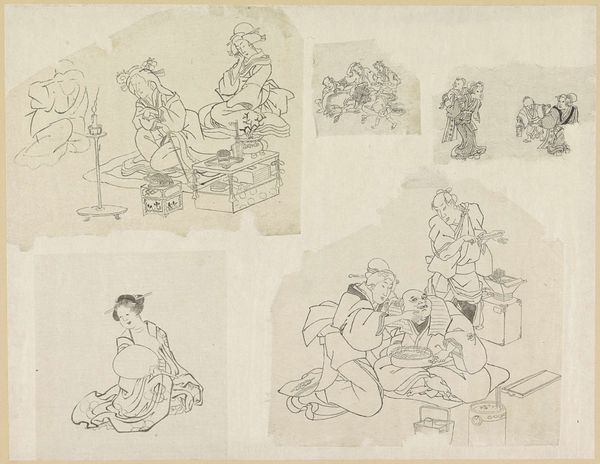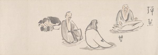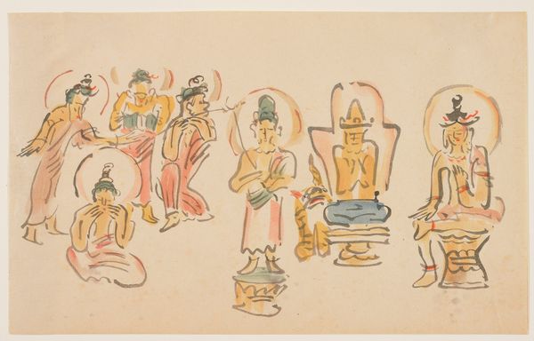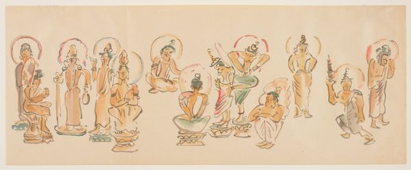 Curator: This work, titled "(Asakusa Kannon temple caricatures B)," was created around 1900 by Awashima Kangetsu. It's a woodblock print rendered with ink and watercolor, a fantastic example of Ukiyo-e currently residing here at the Minneapolis Institute of Art. Editor: It’s remarkably…delicate. The lightness of the watercolor gives an almost ethereal quality to the figures, despite the caricatured forms. I see an ordered yet spontaneous rhythm of repeated circular haloes. Curator: Absolutely. What strikes me is the context of its production. At the turn of the century, there was increasing commercialization of religious iconography. These caricatures were likely mass-produced, reaching a wider audience, reflecting and shaping popular perceptions. This blending of art, commerce, and religious observance really challenges traditional art boundaries. Editor: The economical line work and diluted palette contribute significantly. It’s the restraint that accentuates form. Note how subtle shifts in hue, barely registering, still manage to differentiate the individual figures within the composition. Semiotically, these visual cues point to individual deities within a unified field. Curator: Consider the woodblock printing process itself – the labor involved in carving each block, the number of impressions possible. It connects us to the artisans and vendors involved, making visible the systems of labor and distribution integral to the work's accessibility. What do you make of the varied poses? Editor: Fascinating. They almost tell a narrative. You’ve got figures in meditative stances, some reclining, others seemingly in mid-gesture. There's a flow, a visual poem about reverence, and also, dare I say, human experience? I suppose it captures devotion, but without grandiosity. Curator: Precisely. The commercial nature lessened formality. I would say, thinking about it now, it’s a valuable example of accessible artistry for its time, deeply rooted in its social and material conditions. Editor: And seen from this angle, we see the formal arrangement and the economical rendering, coming together, presenting this particular blend of serenity and humour to us still.