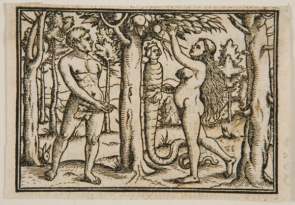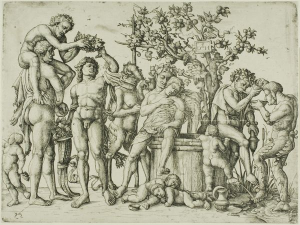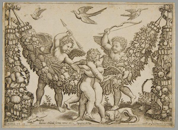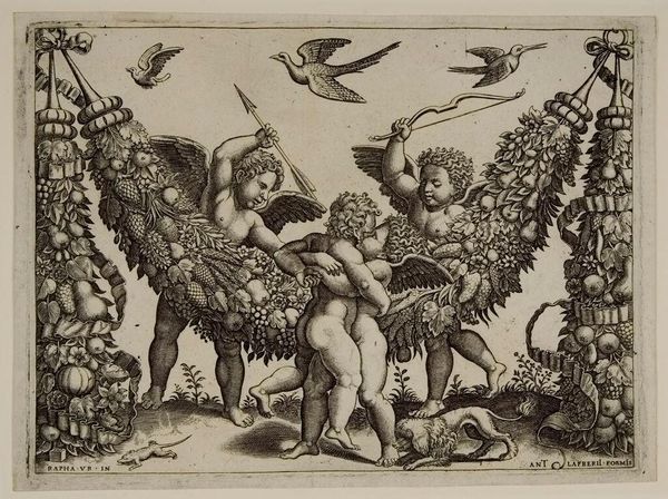 Curator: This print from the Harvard Art Museums depicts Three Cupids Playing With An Ostrich. It is by an anonymous artist. Editor: What strikes me immediately is the sheer abundance, the texture of the engraved line creating dense patterns. It feels rich, almost overwhelming. Curator: The means of production, the labor involved in creating such detail, speaks volumes about the value placed on ornamentation. Note the cornucopia-like garlands framing the scene. Editor: Yes, and the ostrich itself! Throughout history, the ostrich appears as a symbol of appetite, digestion, and perhaps even ignorance. The cupids playing with it... are they taming desire, or indulging it? Curator: Perhaps both? The image points to the complex relationship between labor, leisure, and the consumption of symbolic goods. Editor: I’m left wondering about the cultural context that would give rise to such a peculiar combination of symbols. It's an unusual piece. Curator: Indeed, it offers a glimpse into the material conditions and the symbolic language of a specific historical moment. Editor: A moment where desire, innocence, and abundance meet in a dance of engraved lines.