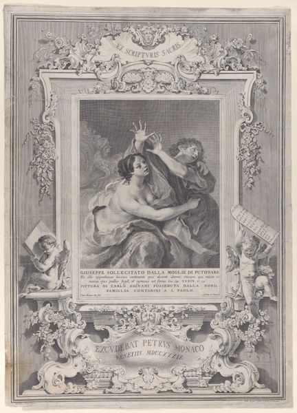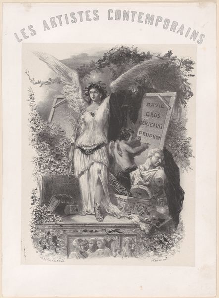 Editor: This is Célestin Nanteuil’s “Title Page for the Revue de Peintres,” created in 1835. It’s a print, so it must be a drawing that was then reproduced. I’m struck by how the central figure, presumably an allegory of painting, is both idealized and quite sensual. How do you interpret this work? Curator: That’s a great starting point. Consider the period – 1835. We're in the throes of Romanticism, yet seeing the rise of industrialization. What does it mean to idealize the artist in a rapidly changing society? This female figure is poised and serene, but what societal expectations and limitations were placed on women, particularly women artists, at this time? Editor: That's true. She's holding a palette, a symbol of her agency, yet her pose also feels somewhat… passive? Was this perhaps a comment on the limited roles available to women artists even within the supposedly progressive Romantic movement? Curator: Precisely! Notice how she is framed—almost literally, on a pedestal. Who gets to define what "art" is, and whose perspectives are privileged? The "Revue des Peintres," whose title appears at the bottom, would have been part of that discourse, setting aesthetic and cultural values, while either including or excluding marginalized voices. How does the gaze, here, function in establishing those cultural norms? Editor: I hadn’t considered it that way, but it's true. By idealizing her beauty, does it subtly undermine her authority as a creative force? Maybe it perpetuates a limited view of women’s roles in the arts. Curator: It could. Exploring how she is presented vis-à-vis the text itself is valuable to consider here. The decorative elements both elevate and enclose her, and could also hint at the commercial and patriarchal framework around artistic practice. Editor: So it is less about individual artistic expression and more about the social context shaping it. I learned a lot; thank you! Curator: Likewise. Thinking about art through these lenses allows us to appreciate not just the skill, but also the silent dialogues it holds with the world around it.