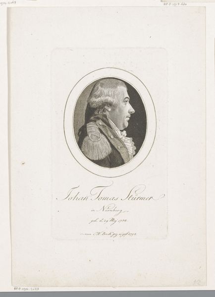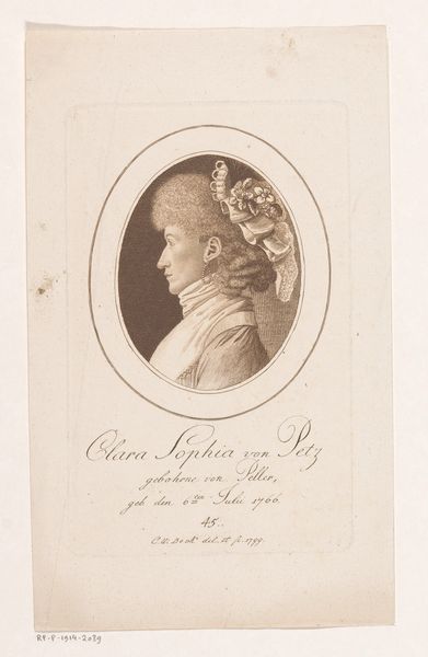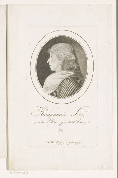Curator: Here we have "Portret van Maria Helena Behaim," created around 1800 by Christoph-Wilhelm Bock. It's an engraving, currently held at the Rijksmuseum. Editor: The immediate thing that hits me is the severe elegance. A portrait frozen in monochrome—it has that distant, almost ghostly aura. The subject gazes away, like she's lost in some profound, unspoken thought. What's her story? Curator: Well, being a portrait, its role within Neoclassical artistic circles, during that time, was to solidify status and present ideals of beauty. The controlled lines of the engraving give her a stoic presence; her very image meant to evoke virtue and respectability in the era’s eyes. Editor: See, I get that – status and all. But look at her headdress! That's personality. Those frills soften that austere Neo-Classical mood. And the single dangling earring…there's a story there! Curator: Definitely! The late 18th century saw this resurgence of interest in the ancient world but with distinct characteristics; Maria Helena Behaim lived during an age of significant upheaval, which the engraving hints through it's austere yet detailed representation of her dress and features. Editor: I agree; the balance between the frills, formality, and direct, unblinking, gaze gives the engraving such dynamism. I mean, on one hand, it's classical but on the other there's this little rebellion— a little glint of life within that constraint. Curator: It is a subtle dance between societal expectations and personal identity. Her clothing style points to belonging in privileged circles but the artistic choices of Christoph-Wilhelm Bock give it all an added layer, a conversation with the self and how we are viewed by society at large. Editor: Exactly! It almost feels like peering through time, like the echo of a conversation we were never meant to overhear. So glad to have stumbled on that piece! Curator: Indeed! And now you've got me thinking about the socio-political conditions during that time which undoubtedly impacted both Maria Helena Behaim, Christoph-Wilhelm Bock, and this portrayal! A compelling reminder of how art is shaped and also shapes us!