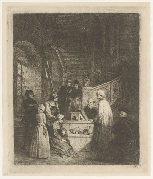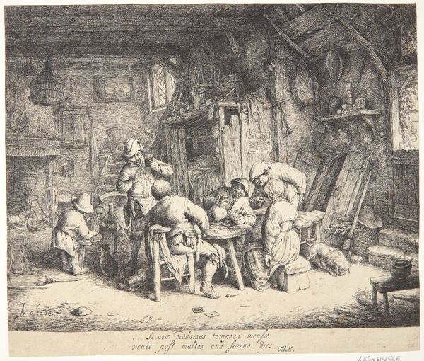 Editor: We're looking at Adriaen van Ostade’s etching, "Peasant Paying his Bill," created sometime between 1610 and 1685. The tiny details depicting this tavern scene are fascinating! But I am most struck by the interior; there is such a strong diagonal between the dark hearth in the background and the patrons and the brighter doorway in the foreground. What's your initial reaction? Curator: You know, it's that light, isn't it? The way it slices across the scene, drawing us into the transaction at the door. Van Ostade was a master of capturing everyday life, and this scene is so richly rendered, you can almost smell the beer and hear the chatter. For me, it's not just the composition but the feeling that Van Ostade transmits; an authentic portrayal of these figures, their humanity rendered palpable. Don’t you think? Editor: Yes, it does feel immediate! It is easy to feel as though we’re intruding, spying, somehow. Does that feeling connect to the genre somehow? Curator: Precisely! Genre painting is rooted in close observation, an attempt to reveal a truth, not unlike what you expect from good investigative journalism. With "Peasant Paying His Bill", Van Ostade almost invites us to partake in a clandestine peek into everyday life. We get the joke. I imagine this scene unfolded more times than he could possibly etch. Editor: The amount of activity packed into such a small image makes it really exciting to analyze, it invites you to linger. Curator: It’s true. Each little mark, each choice, creates this miniature world, so full of implied narratives! Thanks, this viewing made me see Van Ostade anew. Editor: And I learned more about genre painting! A great discovery!