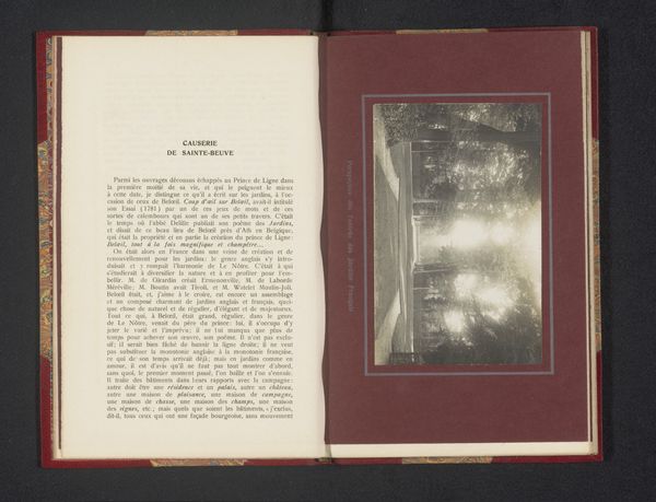 Curator: This albumen print from before 1908 depicts a view of the gardens at the Château de Beloeil. The image, sepia toned, is mounted within the book’s pages and seems to glow from within. What do you make of it? Editor: It feels like a window into another time. The gardens look so meticulously arranged, almost theatrical. How would a viewer from the early 20th century have interpreted this photograph? Curator: Consider the garden itself. Gardens, especially during this period, served as microcosms of power, intellect, and control over nature. This photograph captures that ambition. Also, the use of albumen printing itself - the richness of the tones, the clarity - it speaks to a desire to preserve and present an idealized version of reality. The formal arrangements mirror a wish for clarity and control of how the elite of this period presented themselves. The choice to capture it on photographic print solidifies its cultural significance as well. Do you see any cultural symbolism embedded here? Editor: Yes, now I see it! I didn’t see how the gardens reflected control and aspirations! The balance within the garden symbolizes an ordered, powerful societal hierarchy, perhaps even reflecting social or political landscapes. The garden paths appear carefully calculated as they recede. Curator: Exactly. The receding paths you observe remind me of a stage or labyrinth, the person represented as wandering through life’s mysteries. It can signal a passage to initiation and knowledge, framed within privilege. And who controlled access to the gardens, physically or representationally through images? Editor: Those with the means and status, of course. Thinking about it that way reveals the power dynamics involved. The image functions as a statement. It’s definitely given me a new perspective! Curator: It’s fascinating how seemingly straightforward images hold layers of meaning when we explore the symbols embedded within.