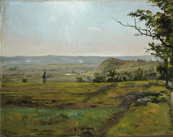 Editor: Here we have L.A. Ring's "A Landscape near Bryrup, Jutland," painted in 1888. It’s an oil painting, and I find the color palette to be so subdued; it really creates a tranquil, almost melancholic atmosphere. What catches your eye, and how do you interpret this work? Curator: It's interesting you pick up on the tranquility, almost a hushed reverence. For me, it’s a very personal landscape. I imagine Ring standing there, taking in not just the scene, but the very soul of Jutland. Notice how the eye is drawn into the depths of the painting, slowly unveiling layer upon layer of earth, the misty lake and the sky… It's not a shout; it's more of a whisper. Editor: A whisper, I like that. The brushwork seems pretty loose; was this painted *en plein air*? Curator: Most certainly. The freshness, the way the light dances...that’s rarely achieved in a studio setting. Think about the era; impressionism was blossoming, but Ring brought to it this particular Nordic sensibility. The romance of nature, tinged with the ever-present awareness of its harsher realities. Do you feel that at all? Editor: I can see the romance now that you point it out, and I definitely feel a groundedness to it. But that also helps to explain the subtle sadness I felt when I first saw it. Curator: Exactly! It’s not saccharine; there’s an honesty. Painting outdoors allowed Ring to be honest, allowing for the slight imperfections in colour and tone. Almost as if nature itself had taken the brush, right? And now, does the painting “whisper” differently? Editor: Absolutely. Now I get a more personal understanding, like the painting wasn't made for all to admire but to offer me a quiet look. Thanks! Curator: Anytime. I will carry this whispering landscape along for a while today.