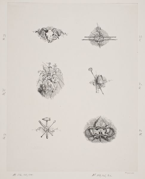 Joakim Skovgaard created this drawing of a sheet with butterfly, beetle, scarab and other insects, with ink on paper. The composition is sparse and clean, with a series of insect figures arranged in a loose, almost playful manner. The insects are rendered with a stark, graphic quality, their forms simplified yet distinct, creating a sense of scientific curiosity blended with artistic expression. The composition could be seen as a visual taxonomy, an attempt to categorize and understand the natural world through careful observation and representation. Yet, the arrangement defies strict order, suggesting a more whimsical or symbolic intent. In the structuralist reading, the work's arrangement and contrast between the defined shapes and the blank paper space prompt a reflection on how we classify nature versus art. The stark black ink against the white paper creates a binary opposition, inviting contemplation on the boundaries of representation. It's as much about the act of seeing and ordering the world as it is about the creatures themselves, reminding us that meaning arises from the structures we impose.