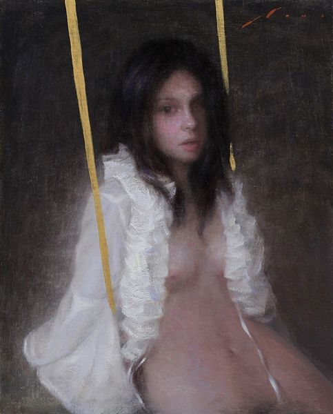 Jana Brike made this strange and affecting painting, "I Am Your Moonlight and Flower Garden," with oils, though it could be a dream. It's got this ghostly palette—pale blues and fleshy pinks, punctuated by red, red lips and the sharp white moths clinging to the figure's skin. The surface is smooth, almost porcelain-like, which gives it that unreal quality. You can feel the artist carefully layering and blending the paint, concealing the process, so what’s left is this perfect, ethereal image. Look how the fabric drapes, half-hiding, half-revealing. The crisp lace contrasts with the soft skin. Those moths—are they emerging from within, or are they drawn to the figure? This tension between vulnerability and a kind of haunting beauty is what gets me. It reminds me of some of the symbolist painters like Khnopff. There's a similar quietness, a sense of mystery, of something hidden just beneath the surface. It's like a memory, or a secret, and it leaves you wondering what it all means.