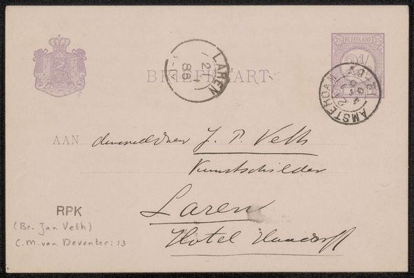 This Briefkaart aan Philip Zilcken by Henriëtte de Vries presents a fascinating display of symbols, notably the heraldic coat of arms. These arms, often emblems of noble lineage, are steeped in cultural significance. Coats of arms originated in medieval Europe as a means of identification in battle and tournaments. Each element—the colors, the animals, and the arrangement—tells a story of valor, ancestry, and allegiance. Such emblems weren't static; they evolved, reflecting shifts in power and alliances. Consider how similar motifs appear across time: the lion, a symbol of courage, appears not only on European shields but also in ancient Mesopotamian art. In each context, the lion embodies power, yet its specific meaning adapts. The enduring appeal of such iconography lies in its ability to evoke subconscious responses, tapping into collective memories and deeply ingrained associations with status and identity. The coat of arms, therefore, serves as a visual anchor, connecting us to layers of history and emotional significance.