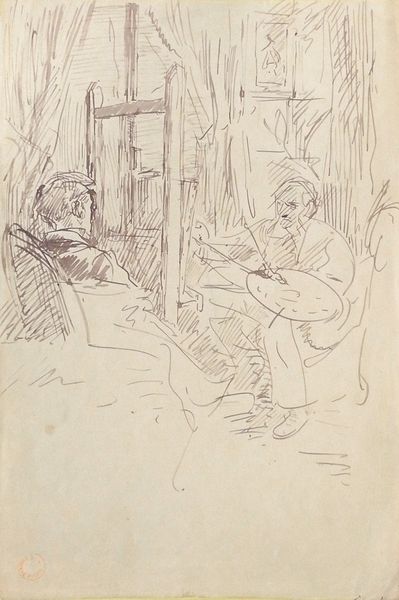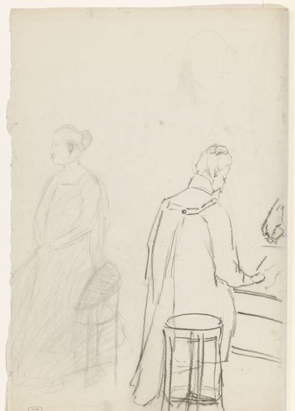 Editor: Here we have Phillip Rumpf’s "Woman Sitting by a Window with a Book", a drawing on paper rendered in pencil. I find the loose sketching style intriguing and somewhat domestic. What can you tell me about it? Curator: Looking at this piece, I'm drawn to consider the very labor involved. The paper, the pencil – humble materials readily available, tools of production democratizing artmaking, aren't they? Think about the societal position of drawing versus, say, oil painting at the time. Editor: I see what you mean! The immediate accessibility of the medium lends itself to more casual depictions of everyday life, as opposed to history paintings with a grandeur style. Curator: Precisely! And consider the 'genre scene' aspect, showing domestic life, a woman reading – this isn't about idealizing nobility but depicting bourgeois consumption, both of goods and, intellectually, through literature. Is the availability of affordable books relevant? Absolutely. The making and consuming are so entwined. What is the function of art production for Rumpf here, if not simply reproduction for the market? Editor: That frames the image so differently than a typical 'romantic' interpretation. So you are arguing for an economic and industrial read on what might seem a simple, private scene? Curator: I'm proposing we look at it not *just* as Romantic yearning but within the broader framework of 19th-century material culture. What the woman can obtain, what the artist uses – the intersection reveals social narratives beyond just her solitary experience. Editor: This focus on the materials, production, and social context definitely provides an interesting layer to consider alongside aesthetic interpretations. I never thought of it that way. Curator: It's about shifting our gaze; how was the sausage made? Let us ask how the artwork was produced as a means to dissect art.