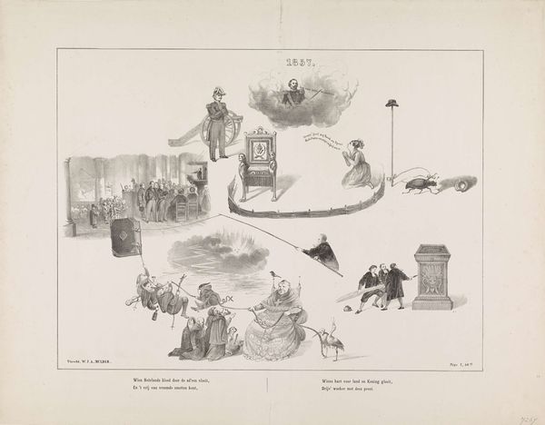 Editor: This is "Spotprent op de bouwplannen van de architect Rose, 1861," a drawing and print in ink by Johan Michael Schmidt Crans. It features two contrasting architectural ideas. The composition has an ironic and slightly critical tone, contrasting classical architectural elements with, well, bubbles. What strikes you about this piece? Curator: I’m interested in the dialogue between tradition and modernity here. It's clearly a commentary on architectural hubris and its societal impact. This feels particularly pertinent today, when debates around urbanization and accessibility often prioritize aesthetic statements over communal welfare. The bubble blower is especially striking. Are those supposed to be structural forms? Editor: It seems that way. They seem very fragile next to the stone elements. What could they mean? Curator: Perhaps a representation of the fragility of grand plans divorced from reality. Caricatures often offer sharp critiques of power. Do you see any indication of whose power is being challenged, or what architectural styles were being interrogated? I'd encourage listeners to examine how art is often at its most effective when it highlights socio-political and cultural tensions within society. Editor: So, it’s more than just an architectural joke. It's really questioning values. I will definitely look closer into those tensions. Curator: Precisely! Spot on. We've identified potential class and access dynamics and this gives us context into our current political discourse. Editor: That really sheds new light on the piece for me. I see the tension so much more clearly now. Curator: Exactly. I hope people think more critically about power dynamics next time they engage with artworks like these!
