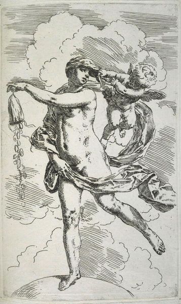 This is an engraving, 'Fortune standing on a globe emptying a purse of coins', made by Simone Cantarini in the 17th century. The composition is immediately striking, a whirlwind of diagonal lines and swirling forms. Fortune is depicted in a state of dynamic imbalance as she empties her purse, creating a sense of instability. A cherubic figure tugs at her drapery, further disrupting the scene's equilibrium. The artist’s lines are not merely descriptive, they carry meaning. The fine, controlled lines define the contours of Fortune's body, while the more chaotic strokes evoke the ephemeral nature of luck. We can also see a commentary on the Baroque era’s fascination with movement and the transient nature of earthly possessions. The image destabilizes any fixed notion of wealth or stability. Fortune is shown dispensing coins seemingly at random, highlighting the capricious nature of fate. The visual language suggests that fortune, like the engraving's lines, is not fixed or immutable but a fluid and ever-changing force.