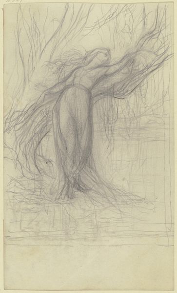Editor: This sketch, "Reiter auf seinem Pferd, in Vorderansicht," which translates to "Rider on his Horse, in Front View," is by Wilhelm Rietschel. It appears to be a graphite or pencil drawing on paper. It looks like a preliminary sketch; the lines are light and suggest movement. What do you see in this piece? Curator: I'm drawn to the archetype of the horse and rider, a powerful symbol throughout history and across cultures. It embodies concepts of control, power, and the harmony between man and nature. In many traditions, the horse symbolizes instinct, and the rider represents the intellect guiding that instinct. Does the figure seem to dominate the horse or vice versa, in your opinion? Editor: I think the rider seems more vulnerable, almost exposed, from this angle. It challenges that idea of dominance you mentioned. Curator: Exactly. And what does the lack of detail contribute? The absence of details, the almost ghostly quality of the sketch, may point to the ephemeral nature of power itself, or perhaps the fleeting moment of connection between the rider and his animal spirit. Consider, too, how the act of drawing itself—a tracing, a rendering—reflects our attempts to capture and understand these primal energies. Does that shift your perception at all? Editor: It does. I was so focused on the sketchiness that I didn't consider how that contributes to the overall symbolism. Thank you! Curator: And thank you. Exploring these visual shorthands allows us to decode the complex cultural memory embedded within even seemingly simple sketches. It’s a journey of continual rediscovery.