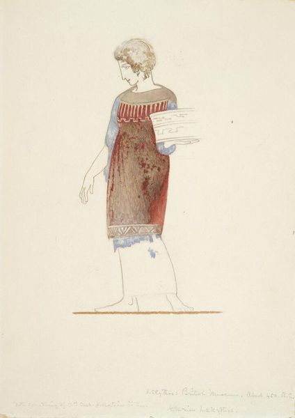 Curator: Carl Larsson created this watercolor, “Rouge et Noir,” in 1906. Let’s take a closer look. Editor: There’s a kind of shy theatricality to this. That drape of vibrant red over the dark…is that a nightgown? It feels like she's stepped out of a dream, or maybe a play, and hasn't quite decided which world she belongs to. Curator: Larsson was known for his intimate depictions of family life and Swedish domesticity. Though less characteristic of that style, "Rouge et Noir" provides an interesting insight into the artistic trends of the early 20th century and his engagement with the female portrait. Editor: Those soft watercolors almost give it an unfinished quality, as if the image is still emerging from the paper itself. I love how the red anchors the eye, while everything else sort of dissolves. Like memory, selective in what it holds onto. Curator: Consider how the symbolism of red and black – desire and the unknown – could signify not just aesthetic choices but societal ones. Did this capture changing attitudes toward female agency during this era? Editor: Maybe! Or maybe Larsson was just playing with color, trying to evoke a mood rather than making a grand statement. You know, sometimes a red cloak is just a red cloak. Curator: While true, even simple things hold symbolic meanings within them. It is undeniable that Larsson positions her in relation to art history and contemporary societal attitudes regarding women. Her demure posture juxtaposed with the transparency of her garments prompts considerations of how women were both objectified and celebrated. Editor: Perhaps it’s this tension, the push and pull between innocence and something a bit more knowing, that gives it staying power. Art that poses a question instead of declaring an answer…that’s the stuff that really lingers, isn’t it? Curator: Indeed, and perhaps the artwork mirrors Larsson’s own inner debate regarding traditions and modernity at the turn of the century. Thank you for that insight, I had not thought about it in that manner. Editor: It was a pleasure!