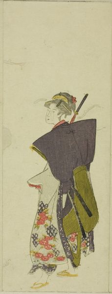 Utagawa Toyohiro created this woodblock print, now at the Art Institute of Chicago, depicting a figure in elaborate attire. This is no mere portrait, but a performance, rich with symbolic inversions. The swords, those potent emblems of samurai authority, are now wielded by someone unexpected, subverting established hierarchies. This playful disruption echoes in festivals of misrule, like the Roman Saturnalia, where societal norms were gleefully overturned. Consider the image of the fool, adorned with bells and motley, a figure who, through jest, reveals profound truths. Similarly, this figure inverts expectations, perhaps critiquing the very structures of power they mimic. Such inversions are not merely humorous; they tap into a collective yearning to challenge the status quo. It is a symbolic act of defiance, inviting us to question the established order. This playful subversion engages us on a deep level, reminding us that symbols are never fixed but always in flux, their meanings shaped by the ever-changing currents of culture.