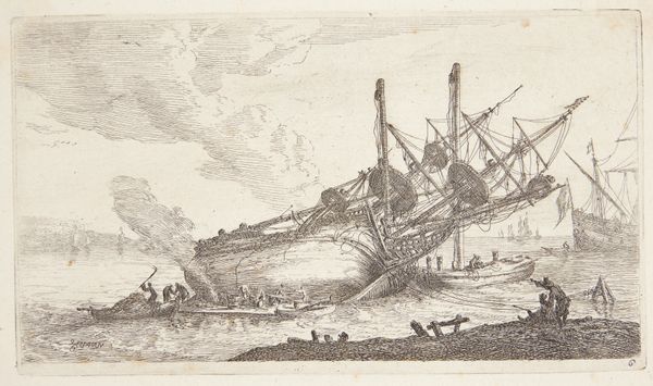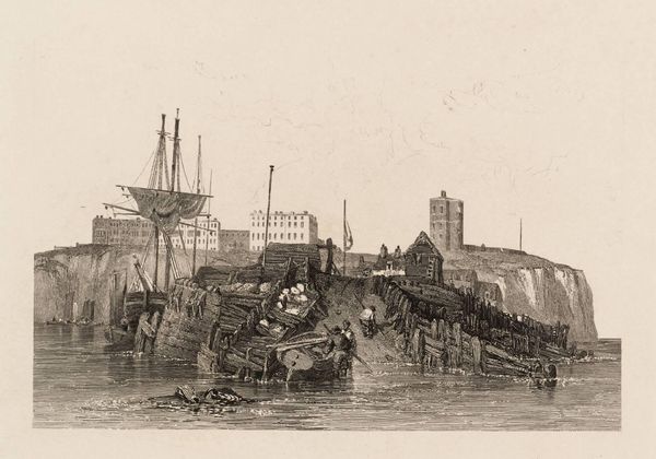 Curator: This is Clarkson Stanfield’s "Portsmouth Harbour," an engraving that captures a slice of maritime life. It’s like stepping back in time, isn’t it? Editor: It feels a bit chaotic, honestly. So much bustling movement, the choppy waves, the sheer activity around the ship. It makes me think about labor and trade. Curator: Absolutely. The details are captivating. Look at the crew loading cargo, the way the light dances on the water. Stanfield had a knack for capturing atmosphere. Editor: I wonder about the politics embedded in a scene like this, the empire building that relies on such port activity and maritime power. Curator: I see it, though I also can’t help but get lost in the sheer romance of it all, the ships, the open water… Editor: These harbors were also sites of forced labor, exploitation, and the violent expansion of colonial power. Curator: Ah, yes. But to look at this seemingly peaceful scene, one might miss that reality. Editor: Exactly, and that's why it’s important to remember the full story. Curator: A story indeed that continues to reverberate in our own time.