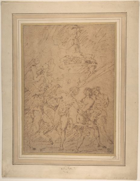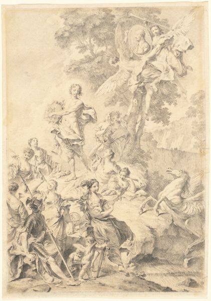 Editor: So, here we have François Boucher’s "Vertumnus and Pomona," dating roughly from 1700 to 1770, residing at the Met. It’s a drawing, done with charcoal, ink, and possibly some printmaking techniques? It feels so whimsical and dreamy, like stepping into a forgotten fairy tale. What leaps out at you when you look at it? Curator: Oh, this piece whispers secrets, doesn't it? Boucher had this incredible knack for infusing classical mythology with such a palpable sense of, well, almost mischievous humanity. Look at how Vertumnus, disguised as an old woman, is pleading his case! What do you make of that little cluster of cherubs up top, overseeing this amorous charade? Are they witnesses or conspirators? Editor: I see what you mean. It is hard to take the mythology seriously. I was trying to figure out why Pomona looks almost, well, faint, and you know I was thinking that she could be feigning shyness, because what's more mischievous than a love trick? It almost looks like she's smiling. Is it really that inappropriate to have that playful, humanistic take? Curator: "Inappropriate?" Never! That's where Boucher truly shines. He wasn’t interested in solemn pronouncements, like a history painter! He relished the flirtatious dance, the knowing glance, the sheer delight of earthly pleasures, though those could be scandalous at times. It’s like he’s winking at us, inviting us to not take everything so darn seriously. Look closely, there, can you see where he’s layered the charcoal to build up the light? Editor: I do, especially on her face, giving it that luminescent glow that sells the flirtatious reading of it. Curator: Exactly! And the background—the blurring of the figures almost fades the world away, suggesting that all that matters is happening between Pomona and Vertumnus. He pulls us into their little romantic universe. Art history, for me, is always just as much a mirror of the artist as the people and contexts around the artwork. Editor: That's beautiful! I never thought about landscape drawing offering such a deeply personal reflection on universal experience. Curator: It’s where the magic truly lies, wouldn't you say?