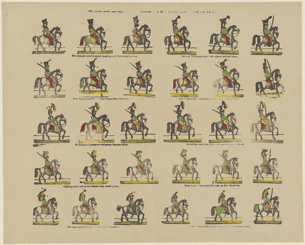 Editor: This lithograph, "Krijgsoefeningen/Manoeuvres militaires," created sometime between 1833 and 1911 by Brepols & Dierckx Zoon, really catches the eye with its almost schematic depiction of soldiers. It's like a regiment laid out on a grid! What visual stories do you think it tries to tell? Curator: This image whispers volumes about order, hierarchy, and the romanticised view of military power prevalent in that era. See how the soldiers, rendered as types, not individuals, become symbols. Each row presents a variation on a theme: standing, marching, riding. Notice the palette. The restricted colour scheme speaks of a visual vocabulary where each shade would carry a message regarding the wearer's role. What meanings or emotional connotations do you think are coded within the rows of soldiers? Editor: It feels very regulated and systematic, I guess, and slightly anonymous. All those uniforms! I see the red as possibly representative of power and/or violence, with blue adding the sobriety or seriousness of conduct to their roles. Are the horses acting more as tools than living creatures in this image? Curator: Indeed. The horse is elevated beyond simple beast of burden to be a partner in conquest. The rigid lines mimic dance notations, but here they document gestures of potential force. Consider the era; lithography made images widely accessible, helping construct national identities. This print would function not merely as a visual record but as an exercise in visual conditioning, reinforcing values of obedience and nationalistic fervor. Do you feel it achieves this now or has that symbolism waned over time? Editor: That's a great point! It makes me wonder about how seemingly simple images carry cultural baggage we might not initially perceive. So, more than just an exercise manual, this piece operates as an icon that condenses ideologies about war, duty, and national pride into a single image. Curator: Precisely! These symbolic condensations speak volumes about the cultural memory woven into visual representation.