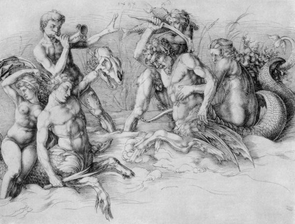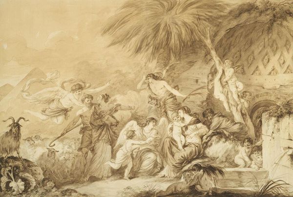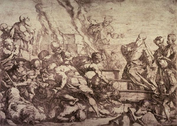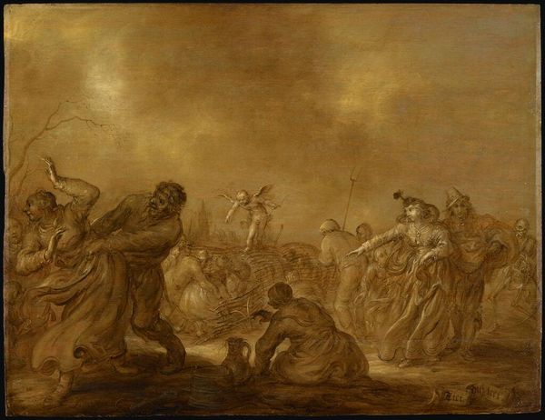 Editor: We're looking at "Street Singers" by Adriaen van de Venne, created sometime between 1604 and 1661. It appears to be an oil painting with possible charcoal elements. I’m struck by how the almost monochromatic palette creates a hazy, dreamlike atmosphere. What can you tell me about it? Curator: This hazy, dreamlike quality, as you say, speaks volumes about the means of its production and the intended audience. Dutch Golden Age paintings like these weren’t just about aesthetic representation; they were commodities. The restricted palette could reflect material constraints - cheaper pigments readily available perhaps? Consider also how this potentially impacted the speed and ease of production and affordability in the art market. Editor: So, it was all about economy? What about the street singers themselves? Curator: Absolutely, economy played a huge part, along with access to specific pigments or materials. What status do these figures occupy in society? We need to look beyond simply 'genre-painting.' Think about what street performance represented in 17th-century Dutch culture. It wasn't detached high art; it was labor, a means of subsistence. Their very existence, represented in paint, is testament to their participation in this economic ecosystem. Consider their clothes, which appear basic, maybe cheap materials. These details aren't accidental; they communicate information about class, labor, and consumption. How might this relate to the art-buying public during the Golden Age? Editor: That's fascinating, I hadn't considered how the cost of materials relates directly to what is being depicted. It seems to bring art history down to earth, somehow! Curator: Exactly! The art isn't divorced from real material circumstances of both its making and its subject. When looking at pieces like this, questioning who is involved in the labor, and what means or cheap techniques are at play really changes one’s perspective on the overall subject.