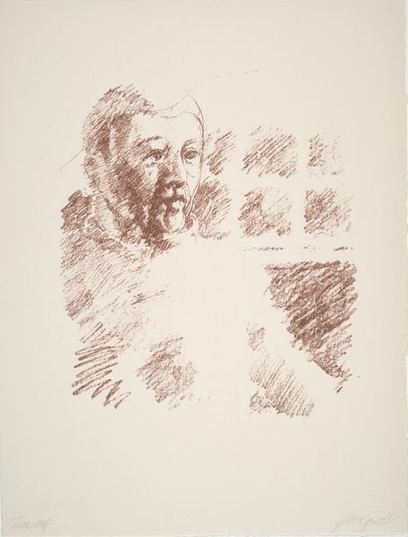 Curator: This etching is a self-portrait by Max Liebermann, the German painter and printmaker, who lived from 1847 to 1935. Editor: What strikes me is the feeling of quiet observation. He captures himself in the act of creation, and there's a certain intimacy in the lines, isn't there? Curator: Absolutely, you can see his gaze is so intent. Perhaps the very act of creating this image has become more important than the need for exact resemblance. He's got a very discerning look. Editor: The hands are really lovely, they are carefully sketched and drawn. In art-historical terms, hands are connected to action and decision-making, and they stand out here. Curator: Good point! It's as if he's not just showing us his face, but inviting us into his process, his world, his experience. Editor: It makes you wonder what he's thinking. What's the meaning of drawing himself drawing? It's like a kind of visual echo. Curator: Exactly, and there's something very compelling about it. It's a window into the mind of an artist, at least for me. Editor: It's a subtle reminder that creating is also about seeing, and being present to oneself. I think this is a wonderful way to finish looking at this portrait.