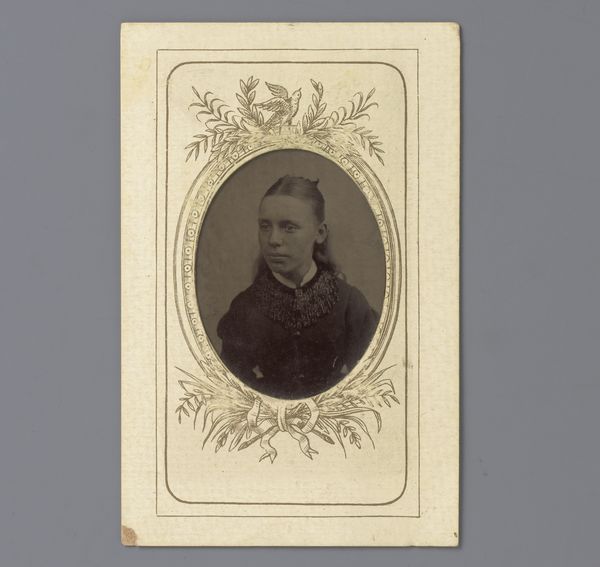 Curator: Looking at this photograph, "Portret van een onbekend meisje" as it is called, created sometime between 1865 and 1885, you can't help but be struck by its simple yet poignant presence. Editor: It’s quite haunting, actually. There's a stillness, almost a resignation, in her gaze. The limited tonal range of the albumen print only adds to that feeling, doesn’t it? Curator: Yes, albumen prints, were so popular then—a readily accessible method. And photography was a fairly novel technology. Editor: So, it was becoming part of everyday life. But there’s also labor involved that we might miss: coating the paper, developing, printing. Each one of these images required a careful hand. I wonder about the economics, too. Who could afford to have their portrait taken, and what did it mean to commission an image like this? Was it for personal memento or for wider circulation? Curator: Those are relevant points. Portraiture became a signifier of middle-class aspirations and visibility in that era. You could see it as an assertion of identity within a rapidly changing social structure. Editor: And what about the sitter, then? Is it possible the photographer gave his directions as to her pose, the knot on her neck, and her hair arrangement? So she can become a consumer object... What about her lived experience, you think? Curator: A challenge with photographs, indeed! We may never know her full story, but even in its seeming simplicity, it offers insights into the period’s aesthetic values, the evolving role of women, and the rise of photographic representation as a social practice. Editor: It speaks volumes about a moment captured, and about the processes and circumstances that conspired to produce this small but potent image. It prompts more questions than it answers, I would say.