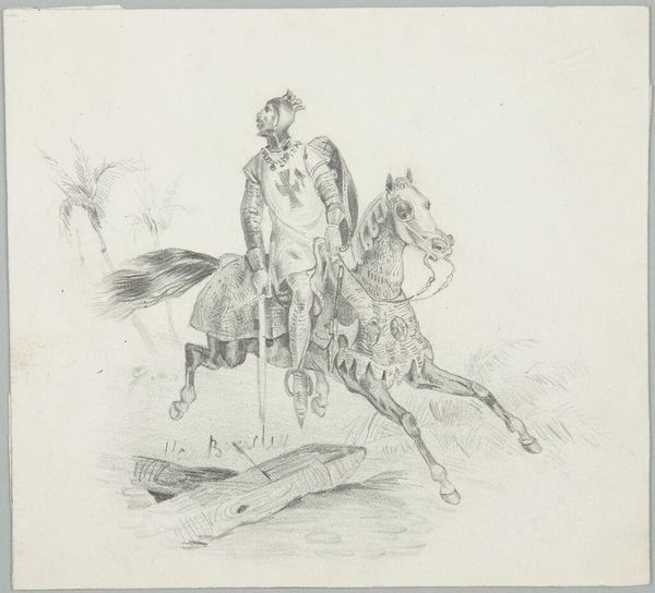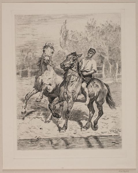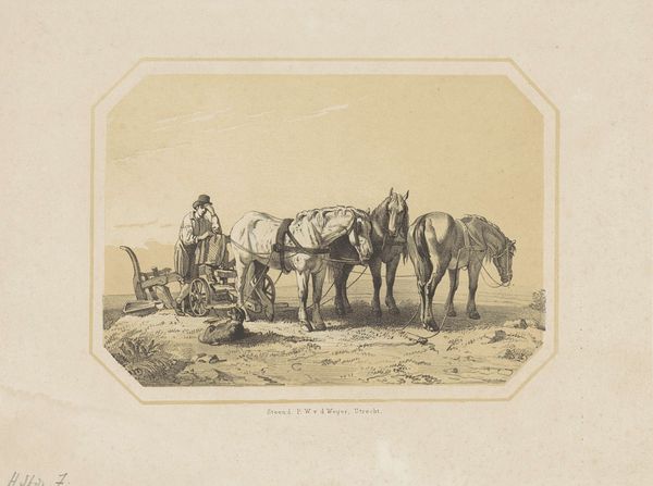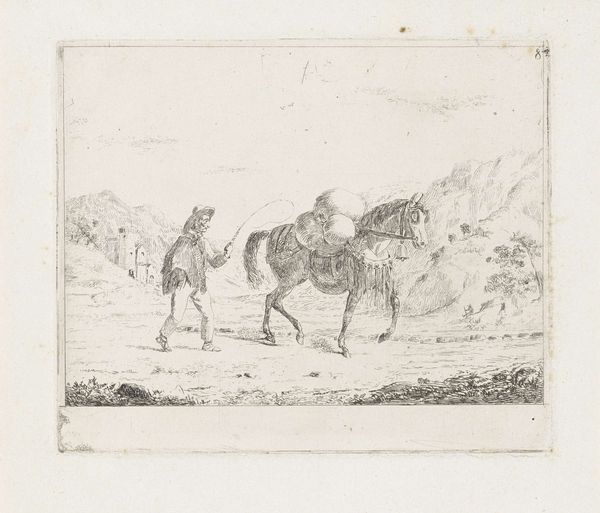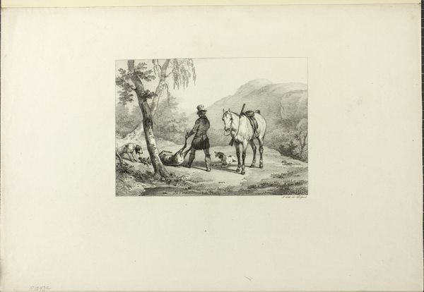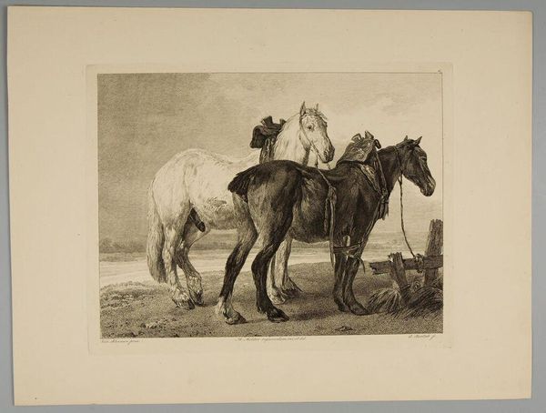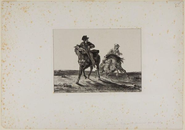 Editor: Here we have Théodore Géricault's "Egyptian Mare," a print that feels both classical and exotic to me. I'm curious, what's your read on this piece? Curator: For me, it whispers of adventure and the romance of the Orient, doesn’t it? Géricault, though French, never actually went to Egypt. The mare is so powerful, yet the scene feels filtered through a European lens of imagination, a dream of another world. It is almost as if the artist wants us to travel. Editor: I hadn't thought of it that way, like a portal! Thanks for sharing that perspective. Curator: And thank you for noticing the magic. I think that’s what great art does: it invites us to travel to places real and imagined.