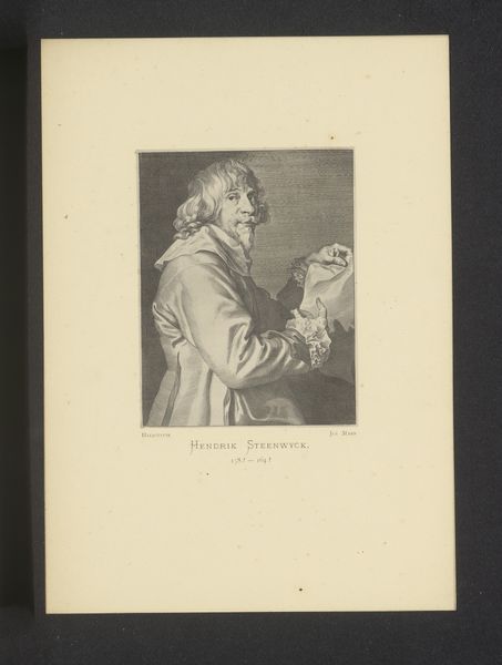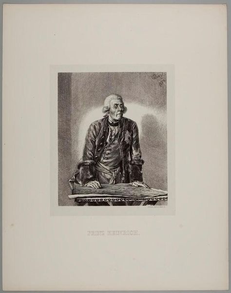 Curator: Eduard Kretzschmar, born in 1807, created this engraving entitled "Aus Koenig Friedrichs Zeit: Fouque." Note the exquisite detail achieved through the printmaking process. Editor: The sharp contrasts really catch the eye. There is an almost unsettling rigidity in the sitter's posture. Curator: Indeed. The print depicts Fouqué, referencing the era of King Frederick, so it carries a weight of historical and social commentary. The materials used—the paper, the ink, the printing press itself—speak to the democratization of image production at the time. Editor: And the formal elements underscore that rigidity. The stark lines of his coat, the almost severe expression... Curator: It's a piece that invites us to consider the means of its making and the cultural forces it represents. Editor: Precisely, and the composition itself adds layers to that interpretation. Curator: A compelling look at history and craft. Editor: Yes, a somber reflection rendered with meticulous skill.