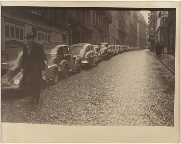 Robert Frank captured this gelatin silver print, "Boy with Baguette, Paris," sometime in the mid-20th century. Immediately, the composition divides into three vertical planes. The foreground features the boy, a stark vertical figure with the baguette, establishing a visual rhythm. The middle ground shows a car juxtaposed with a distant figure. The background blurs, adding depth. The use of black and white flattens the perspective and emphasizes tonal contrasts, heightening the grittiness of the Parisian street. The converging lines of the cobblestone street and the buildings create a sense of depth, pulling the viewer into the scene. The photograph’s geometry, with its play of lines and shapes, creates tension between the foreground and background elements. Frank's masterful use of shadow and light is more than aesthetic; it underscores a sense of alienation and urban isolation. The photograph encapsulates a moment, yet its formal qualities invite ongoing interpretation, reflecting broader cultural anxieties about modernity and representation.