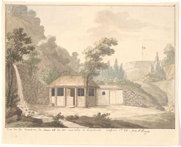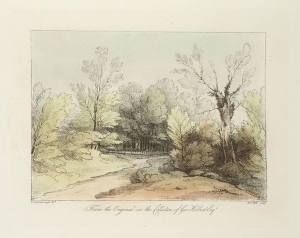 Curator: Here we have an untitled print by Thomas Gainsborough, dating from the late 18th century. It’s currently held in the Tate Collections. Editor: It feels so tranquil, almost dreamlike. The soft hues and delicate lines give it an ethereal quality. Curator: Gainsborough, though renowned for his portraits of the elite, frequently indulged in landscape art. His approach was often experimental, a way to explore the aesthetic theories of the time. Editor: Absolutely. It's clear he's engaging with notions of the picturesque – that ideal landscape. But look at the quaint cottages. Is he romanticizing rural life, or acknowledging the social realities? Curator: It’s likely both. The art market of the time celebrated such idealized scenes, but artists like Gainsborough were also part of a shifting social fabric, where these rural spaces were increasingly commodified. Editor: I agree. It makes you wonder about the narratives excluded from these idyllic depictions. Whose labor made this leisure possible? Curator: Precisely. Considering such questions helps us engage critically with these seemingly benign images. Editor: It does. This piece reminds us that even landscapes are never neutral territory.