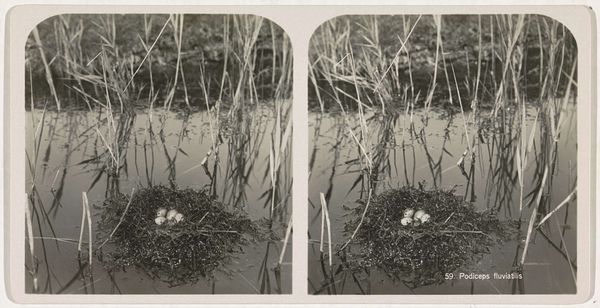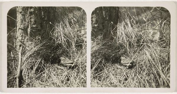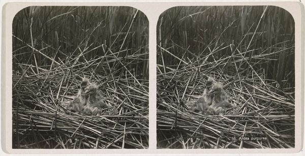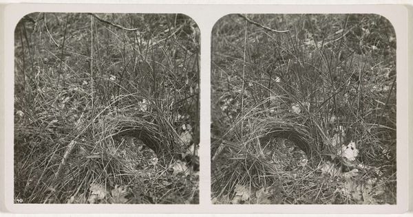 Curator: Let's discuss "Nest van akkerleeuwerik," or "Nest of the Skylark" by Adolphe Burdet, a photograph taken sometime between 1870 and 1940, and currently held in the Rijksmuseum. What are your first impressions? Editor: Intimate, almost voyeuristic. It's a seemingly casual glimpse into a private space, made entirely of natural materials. I'm immediately thinking about the labor involved—both the bird’s and the photographer’s. Curator: Precisely. It’s intriguing how this rather common scene becomes a subject of artistic interest, reflecting a burgeoning interest in the natural world and rural life during that period. Think about the rise of environmental awareness—how did imagery like this contribute to the broader social dialogue? Editor: It prompts questions about access, doesn’t it? This level of detailed observation implies a deliberate intervention into the animal’s habitat. Was it purely documentary, or were there compositional manipulations at play, rearranging the grasses? What tools did Burdet use and how portable were they? Curator: Burdet was certainly operating within a context of increasing professionalization in photography. Photography became a tool for scientific observation, like documenting a specific bird habitat. His use of the medium serves the dual purpose of objective record and subjective expression. How does the stark realism play into the larger art market? Editor: Realism here is compelling because it reveals materiality so bluntly: the woven grass, the mud, maybe even the down feathers all mashed together to build this organic architecture. Consider too, that someone has gone to this very labor intensive effort. The craft speaks of resilience. The landscape as labor. Curator: Indeed. What’s striking to me is how this image circulates. Placed in the context of a museum like the Rijksmuseum, does it elevate a humble bird's nest to an object of cultural significance, worthy of preservation and study? Editor: Right, what was once transient, ephemeral, crafted from what was directly to hand, is rendered a lasting testament to both skill and vulnerability. A material artifact of animal endeavor made enduring through industrial technology, fascinating! Curator: This photograph really offers an insightful glimpse into a world we often overlook, compelling us to appreciate the intricate beauty found in the ordinary. Editor: Absolutely, it's a powerful reminder of the complex interactions between nature, labor, and the lens of artistic observation.