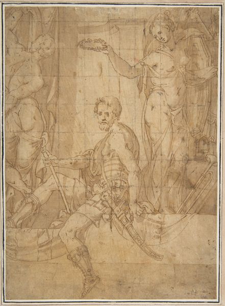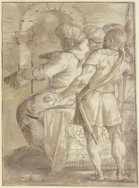 Editor: So this drawing, “Der Heilige Crispinus” by Ludovico Carracci, captures Saint Crispinus with an angel, rendered in ink, chalk, and charcoal on paper. I’m struck by the fluidity of the lines, giving it an almost dreamlike quality, but I wonder, what stands out to you in terms of its composition and the artist’s technique? Curator: The handling of line is indeed noteworthy. Observe how Carracci uses varied line weights to delineate form and create spatial depth. The saint’s robe, for instance, is rendered with a series of curvilinear lines that generate the effect of cascading folds. The angel at his side, meanwhile, displays a softer, more delicate execution, particularly around the wings, achieving a textural contrast. Do you notice the saint's positioning in relation to the architectural niche? Editor: I see it! The curve of the niche behind him mimics the soft curves of his figure, making the whole drawing feel contained. I am noticing also a contrast with the sharper lines and angles defining the angel. It's interesting how that affects the overall visual balance, but how does the artist balance hard vs soft qualities? Curator: A keen observation! Consider the relationship between the saint’s pointing gesture and the placement of the angel’s gaze. Carracci seems intent on guiding our eye through a particular sequence: from the saint’s hand, downward to the angel, and then back up to the saint’s face. Notice the resulting effect: the artist encourages us to consider not simply each figure in isolation, but the psychological exchange that occurs between them. Editor: That makes me appreciate the careful arrangement of the figures and the lines that make it so powerful. Thanks for helping me see this Carracci drawing with new eyes! Curator: The exercise in perception has benefited us both, no doubt.