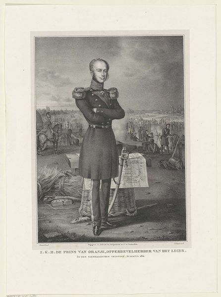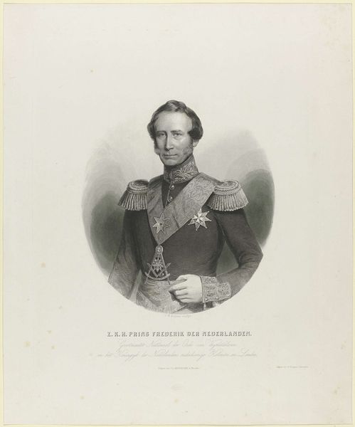 Curator: This is a print of Willem II, King of the Netherlands, dating from about 1826 to 1829, created by Claudio Linati. It's currently held here at the Rijksmuseum. Editor: My first thought is how formal it is! The high contrast creates an undeniable sense of regal composure, and his direct gaze, while gentle, projects a definite air of authority. Curator: Authority indeed. Note the lion in the background, a potent symbol of Dutch power and pride throughout history. Linati is placing William II quite deliberately within that tradition of strength and national identity. It also reinforces the historical narrative. Editor: Yes, the lion subtly echoes the posture of William. Speaking technically, the stark lines really highlight his youthful features and sharp uniform details, those meticulously engraved medals and epaulettes. Curator: Those decorations are visually powerful—they aren’t just aesthetic elements but rather concrete representations of his military and civic achievements. They ground him in a historical reality that the symbols can't convey. Editor: You're right, they also add another layer of meaning. Thinking of the visual structure, there’s a balanced composition in the use of light and shadow which provides dimensionality to the image. The medium adds texture—that tight hatching. Curator: Engravings like these were quite effective in shaping public perception of leadership at the time, mass producing specific visuals and easily distributing certain ideals or concepts. It wasn't about the artistic merit as much as the accessibility. Editor: I hadn’t thought of it that way—like the Instagram of its day, conveying carefully cultivated images and ideals. Considering how Linati skillfully utilized visual elements to communicate these notions of authority, perhaps we should focus less on function... Curator: It does bring up an interesting point though: it goes to show how powerful images, both artistic and not, can shape national identity. The intersection of propaganda and portraiture, a fascinating territory! Editor: Indeed! It all makes one appreciate the carefully crafted layers of meaning here, more than at first glance.