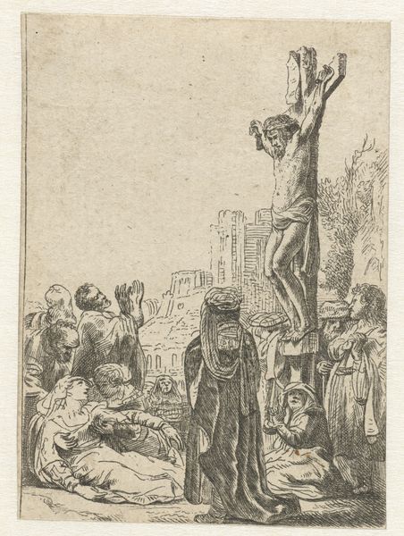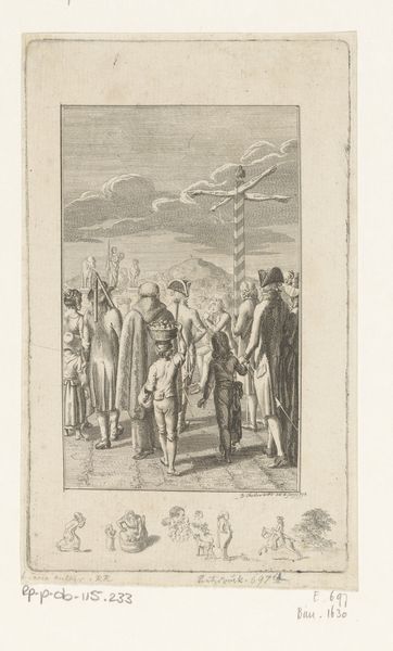 Editor: This is "Uglspil ved galgen", or "Evil Play at the Gallows," a woodcut and ink drawing made by Andreas Flinch in 1841. It's striking how much detail he achieved with simple lines. What catches my eye is the contrast between the relative clarity of the central figures and the haziness that surrounds them. What do you make of its composition? Curator: I find the deployment of line particularly compelling. Notice how the artist uses varying line weights to create a sense of depth and visual hierarchy. The central figures, rendered with darker, more precise lines, command our immediate attention, while the background is suggested with lighter, less defined strokes. The composition’s success hinges on the stark juxtaposition of crisp detail and atmospheric suggestion. Editor: That’s interesting! The varying line weights do seem to guide my eye to different elements. Are you suggesting the composition is all about contrasting the distinct with the indistinct? Curator: Precisely. Observe the way the solid wood of the gallows provides a strong vertical anchor, stabilizing what could easily descend into chaos. The linear repetition within the gallows itself—the parallel planks, the rungs of the ladder—lends structure to what would otherwise be a scene of disorder and emotional turmoil. But consider the figures; are they unified by line or divided? Editor: Divided, I think. The subjects in the foreground appear contained by meticulous outlines whereas those toward the back almost disappear into the smoky haze. What impression is left with such a disparity of line work? Curator: This stylistic variance creates a visual barrier, separating those closely connected to the spectacle of “evil play” from those forced to spectate from a distance. The work establishes, through these structural and compositional components, both the physical and emotional dimensions of the narrative. Editor: It is remarkable how effectively line weight and the density and spacing of the linework itself defines depth and drama. I didn't recognize it at first! I'll definitely pay closer attention to that aspect in future analyses.
