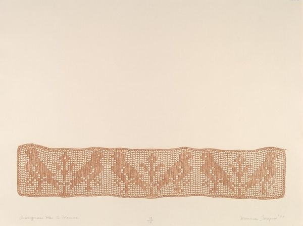 This is a belt of unknown origin, made with glass beads. The work presents a linear composition, emphasizing horizontality. Its structure involves alternating light and dark diamond shapes along the band, creating a rhythm that is visually grounding, yet subtly dynamic. The repetitive diamond pattern might suggest an underlying structure of encoded information that transcends mere aesthetics. It raises questions about the symbolic use of geometric shapes within a specific cultural context, and the semiotic interplay between form and meaning. The contrasting bead colors against the linear arrangement further challenge fixed meanings. The beadwork is an engagement with perception, power, or representation. The horizontal emphasis and geometric patterns invite ongoing interpretation and reinterpretation, opening a dialogue on the nature of signs and symbols.