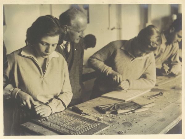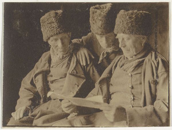 Curator: Looking at this striking image, "Portret van twee mannen in Volendamse klederdracht, zittend aan een tafel," captured sometime between 1900 and 1910 by G. Hidderley, what strikes you first? Editor: The concentration, definitely. Both men are deeply focused on what they're doing, heads bent, almost like a secret being shared on the table in front of them. Curator: Yes, and that intensity tells a story. Considering it was taken during a time when photography was increasingly used for documentation, how might this portrait function beyond simply depicting these two men? Volendam was quite an attraction for artists and tourists at the time, you know. Editor: Exactly, and the very act of photographing men in traditional Volendam attire brings the process of cultural representation into the forefront. Look at the materiality of their clothing—the fabric, the intricate patterns around the neck, even the fur hats seem deliberately chosen and positioned to emphasize their cultural identity. It speaks to the commodification of culture. Curator: Interesting point. I see the photographer also plays a role in staging and disseminating these identities. Photographers of this period acted as brokers, reinforcing or even constructing popular ideas of the "typical" Dutchman for both domestic and international consumption. They knew there was a market for exotic imagery. Editor: And how were these photographs disseminated? Were they postcards, used in ethnographic studies, displayed in exhibitions? The method of circulation tells us about its audience. This portrait could serve both nostalgic longings and reinforce stereotypes about Dutch life for consumption. Curator: Perhaps both! And that tension between documentation and constructed imagery, especially regarding cultural identity, is a recurring theme in photography from this era. What remains powerful, even today, is this portrait opens doors to question how identities are performed and sold. Editor: Agreed. Examining these visual relics and unpacking these old narratives enables us to unravel our present complex tapestry of culture and heritage. Curator: Absolutely. It's always enlightening when we peel away the layers of time to see not just what’s depicted, but why.